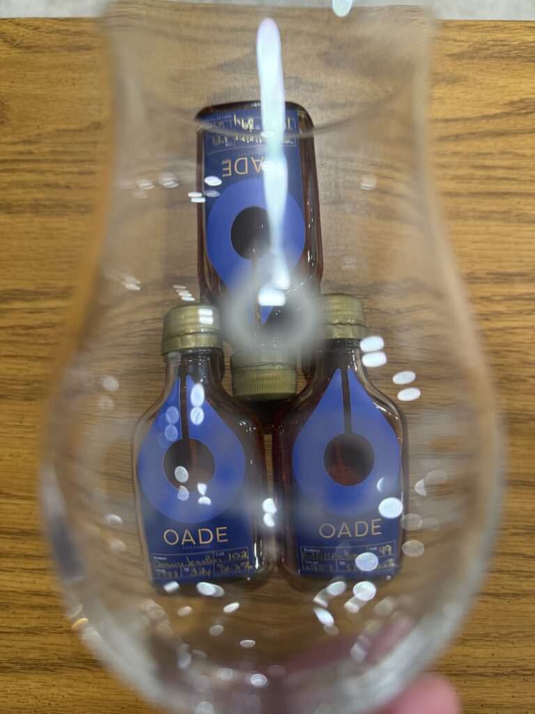 Three oade samples on desk with tasting glass balanced on top in front of liquor collection